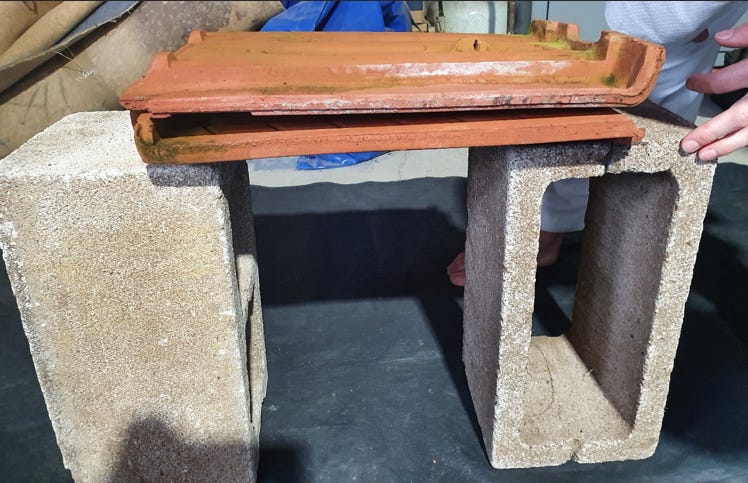 You don’t want the supports too close together – as far apart as possible without dropping the stack makes the tiles easier to break.